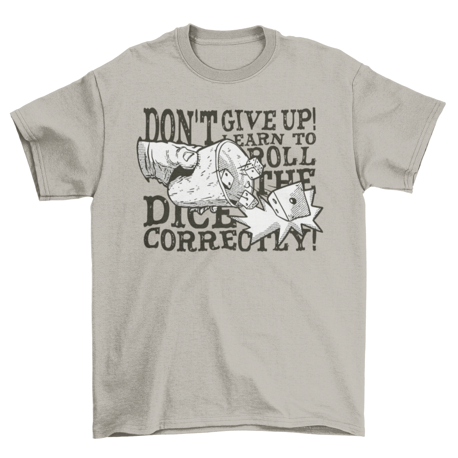 Great t-shirt design featuring a hand rolling dices from a cup and the quote "Don't give up! Learn to roll the dice correctly".